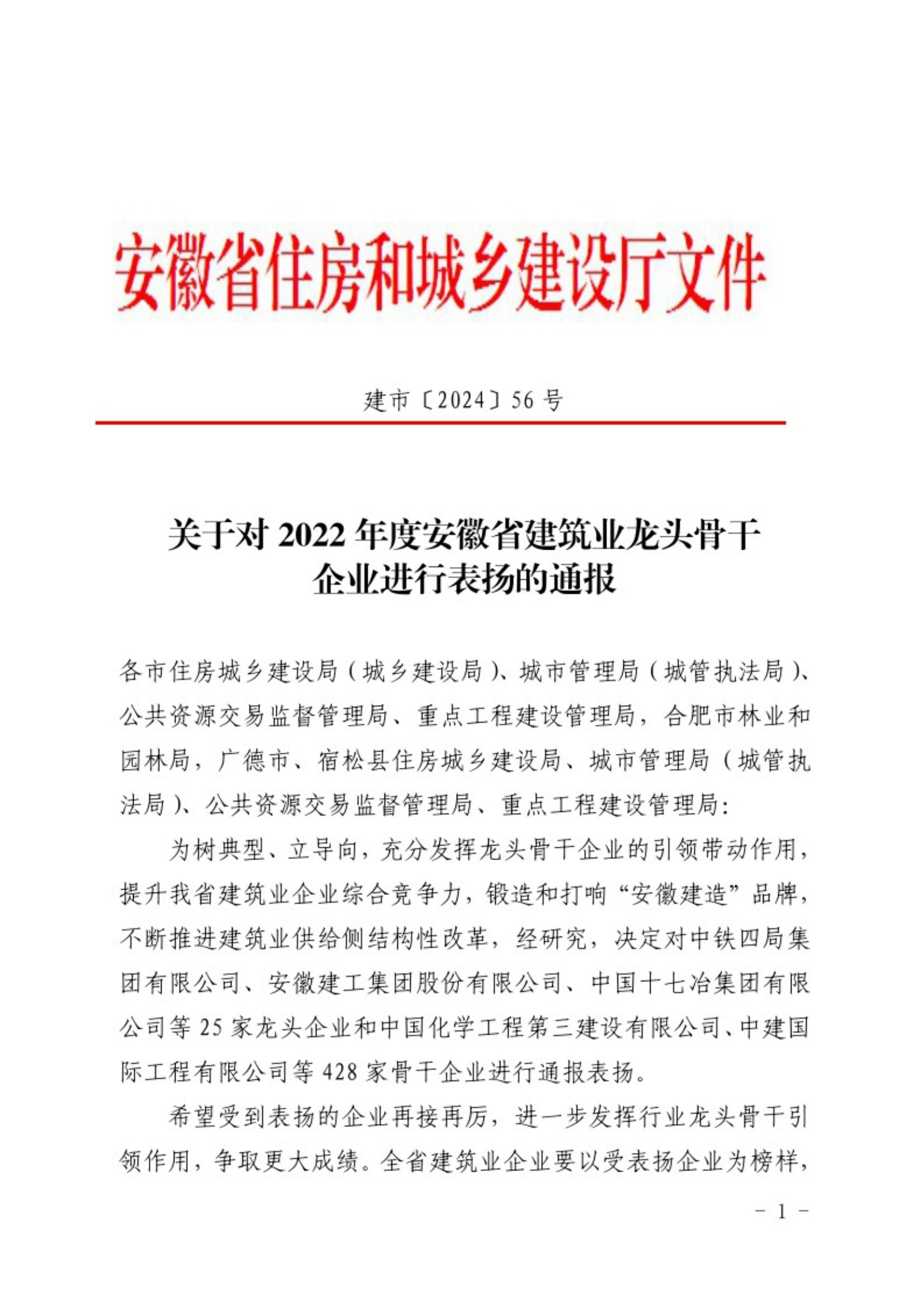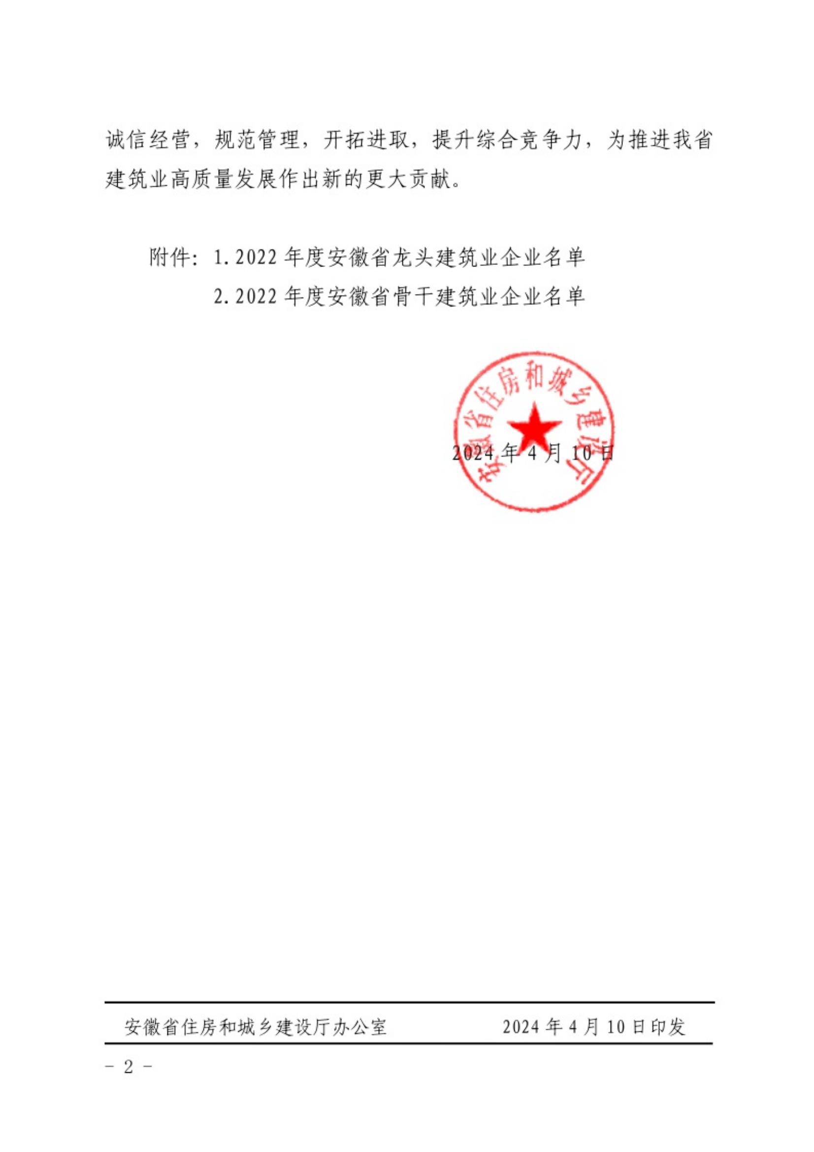 2024年4月10日,安徽省住房和城乡建设厅对“2022年度安徽省建筑业龙头骨干企业”进行了表扬,我司荣登榜单。