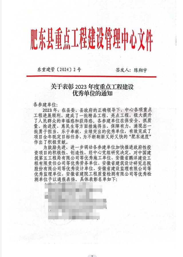 新年新气象,喜报开新局。2024年1月17日,肥东县重点工程建设管理中心下发《关于表彰2023年度重点工程建设优秀单位的通知》,我司监理业务收获业主好评,并受到表彰。