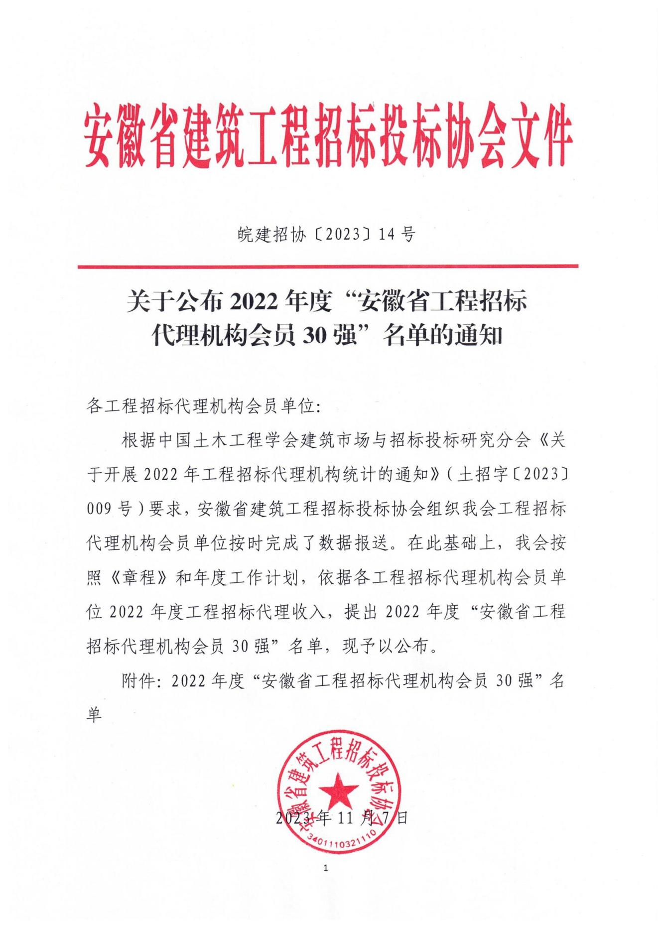 近日,从安徽省建筑工程招标投标协会获悉,我司再次荣登2022年度“安徽省工程招标代理机构会员30强”榜单。