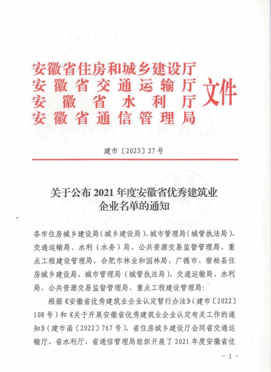 近日,安徽省住房和城乡建设厅、交通运输厅、省水利厅、省通信管理局联合公布了“2021年度安徽省优秀建筑业企业”名单。我司再次荣获全过程工程咨询类“2021年度安徽省优秀建筑业企业”。这是自2020年“安徽省优秀建筑业企业”首次认定以来,我司连续两年斩获该项荣誉。
