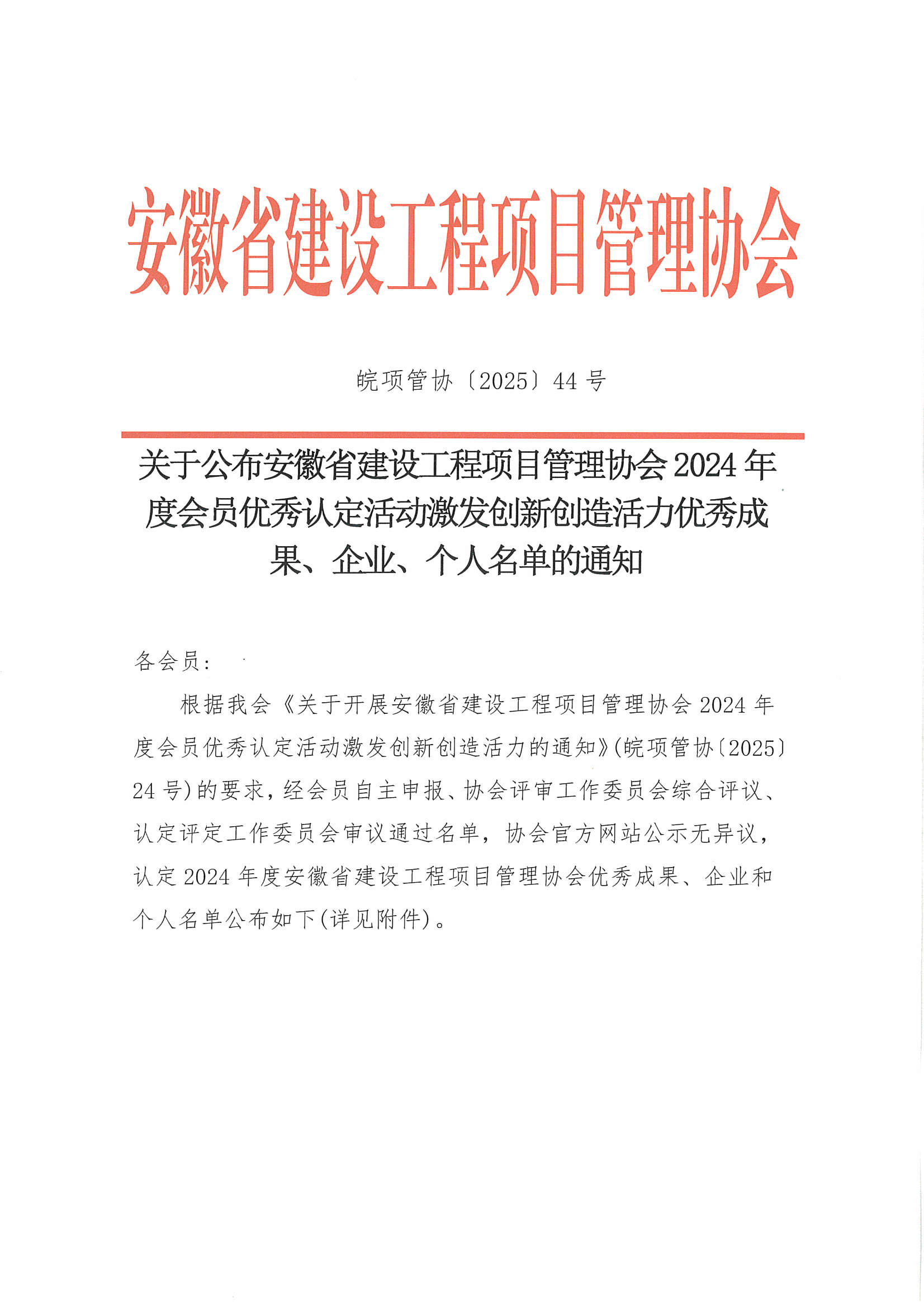近日,安徽省建设工程项目管理协会发布了《关于公布2024年度会员优秀认定活动激发创新创造活力优秀成果、企业及个人名单的通知》。我司凭借出色的技术实力与突出的创新能力,荣获“优秀全过程工程咨询企业”“优秀工程监理企业”“优秀造价咨询企业”“优秀第三方巡查企业”“优秀勘察设计企业”“优秀工程咨询(投资)企业”等多项企业荣誉。同时,我们还有多类优秀项目成果和优秀个人获得表彰,累计共40项荣誉。这一系列沉甸甸的荣誉,是对我司全过程工程咨询能力与专业人才梯队建设成果最有力的证明!