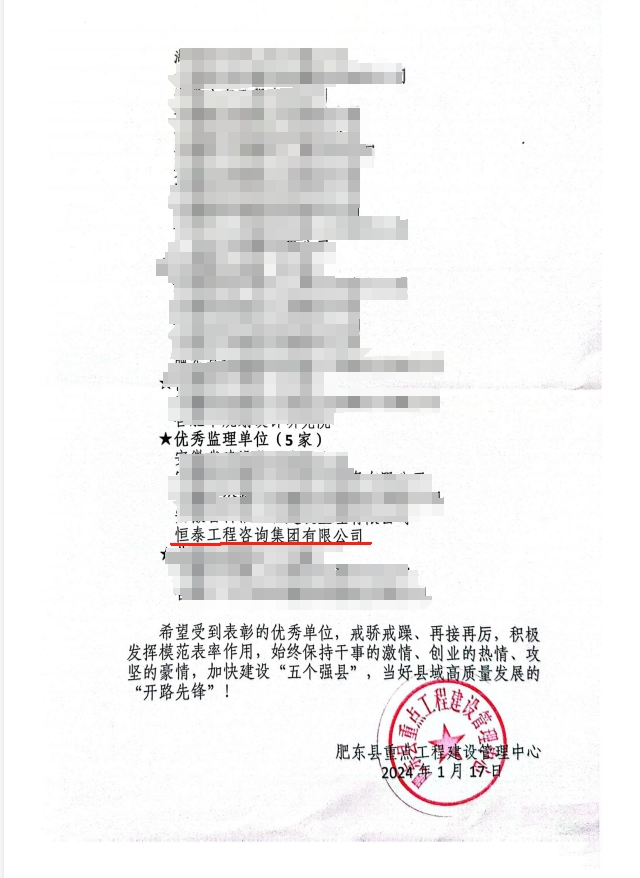 新年新气象,喜报开新局。2024年1月17日,肥东县重点工程建设管理中心下发《关于表彰2023年度重点工程建设优秀单位的通知》,我司监理业务收获业主好评,并受到表彰。
