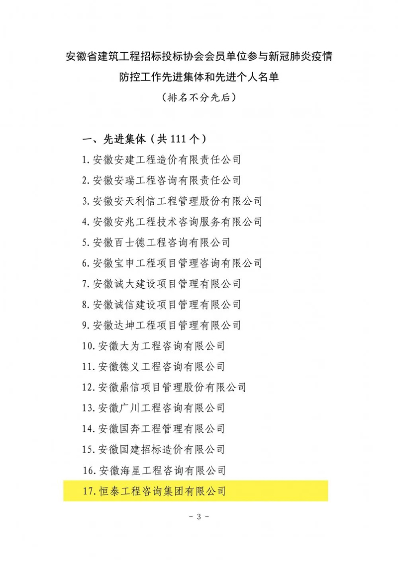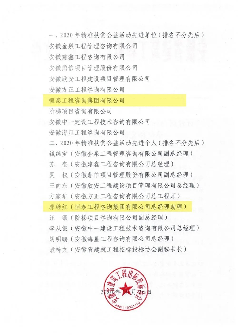 为表彰先进,树立典型,激励企业持续不断为社会公益事业奉献爱心。近日,安徽省建筑工程招标投标协会表彰了一批《参与“百社进百村”精准扶贫公益活动先进会员单位和先进个人》及《参与新冠肺炎疫情防控工作先进集体和先进个人》。我司均榜上有名,这充分展现了我司的社会责任和担当。