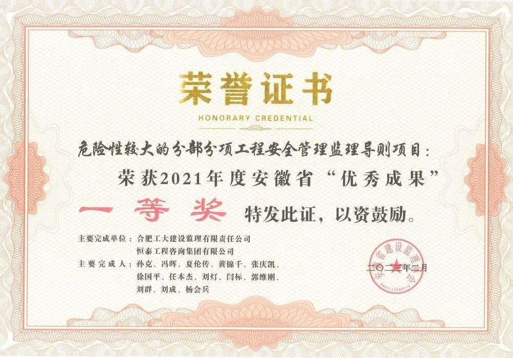 在取得众多荣誉中,《危险性较大的分部分项工程安全管理监理导则项目》荣获2021年度安徽省“优秀成果”一等奖,特别引人注目。我司作为主要完成单位,对此荣誉格外珍视。