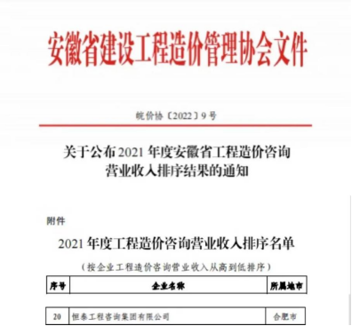 NO.11 集团公司招标代理业务持续稳步增长。安徽省建筑工程招标投标协会官网12月底公布,我司荣获2021年度“安徽省工程招标代理机构会员30强”荣誉称号,位列第六。