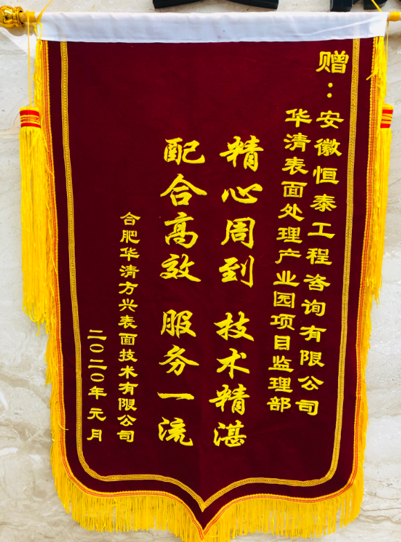 这面锦旗既是业主单位对华清表面处理产业园项目监理部全体人员最好的褒奖,也是对我公司的一种认可。未来,我们将继续恪守“认认真真做好每个项目”的企业经营理念。以专业优质的服务,为工程质量安全保驾护航,为合肥市大建设贡献新力量。