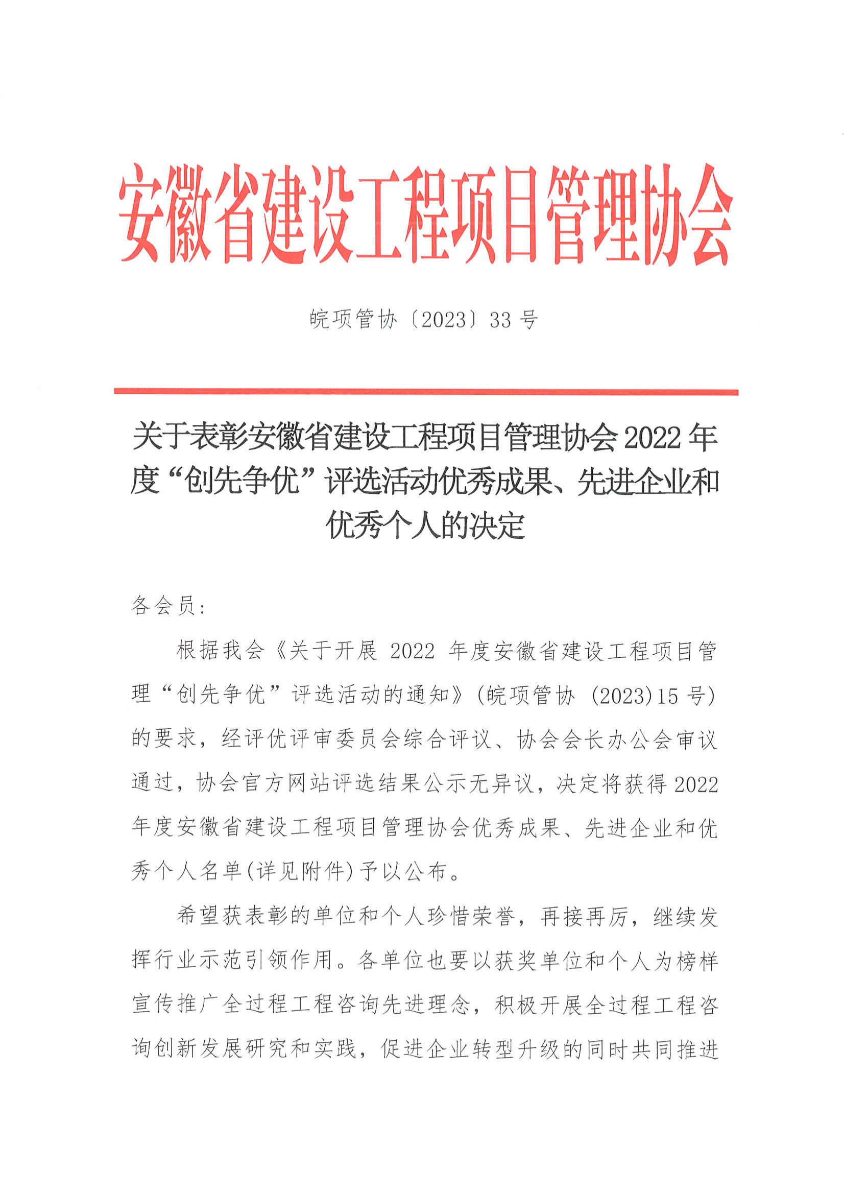 近期,安徽省建设工程项目管理协会公布了《关于表彰安徽省建设工程项目管理协会2020年度“创先争优”评选活动优秀成果、先进企业和优秀个人的决定》的文件,我司凭借卓越的技术实力和突出的创新能力,荣获先进全过程工程咨询企业、先进工程监理企业、先进造价咨询企业、先进招标代理企业、先进勘察设计企业、先进工程咨询(投资)企业、各类优秀成果、各类优秀个人等35项荣誉称号。
